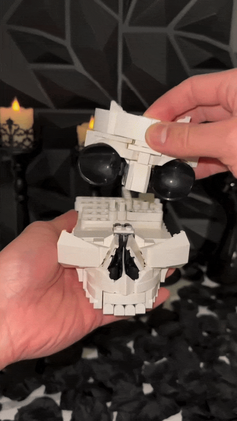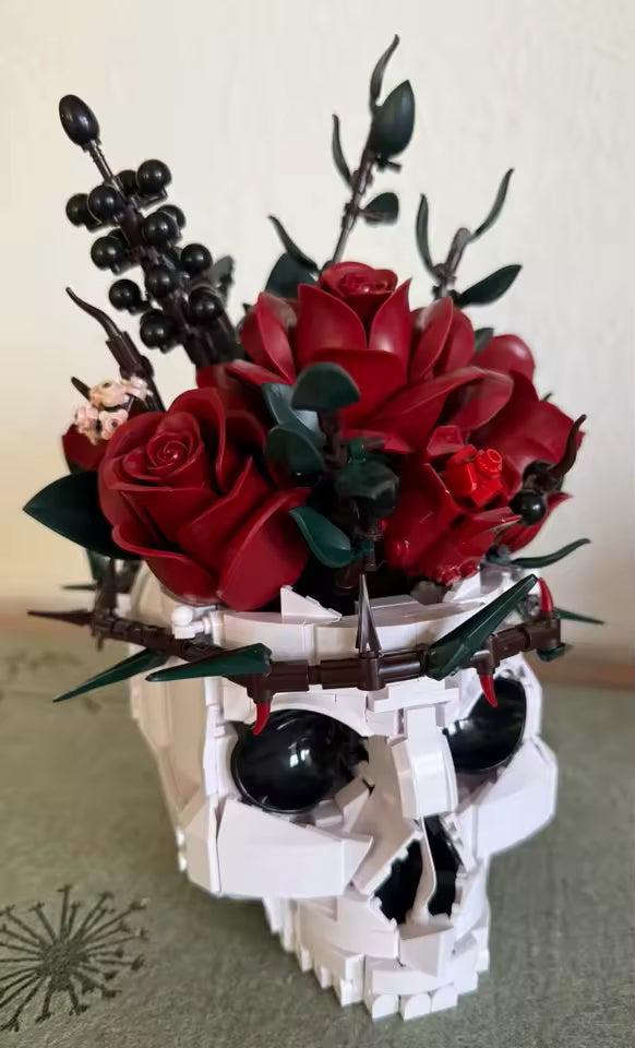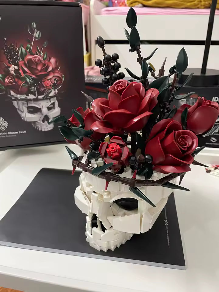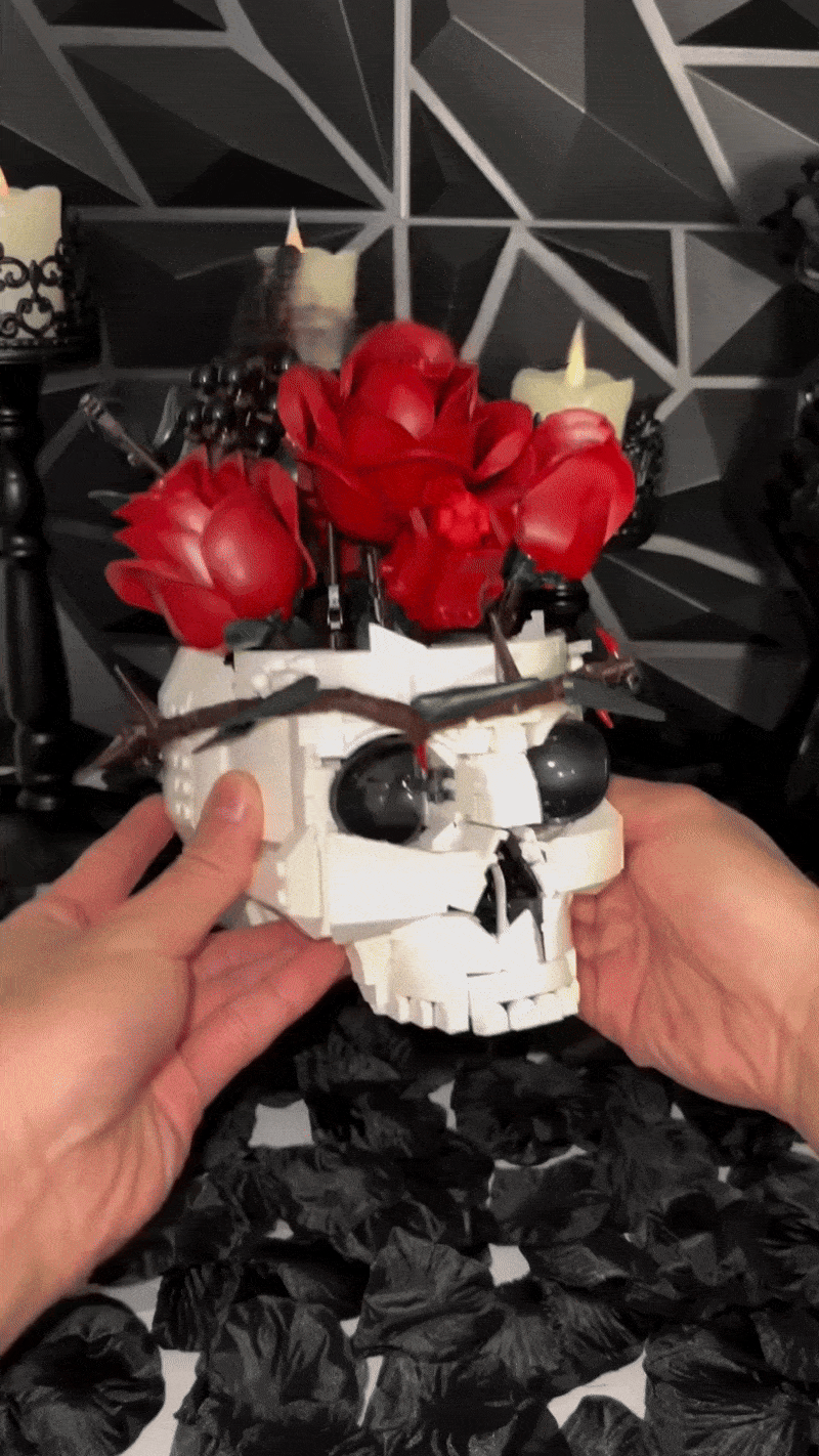 The GothBrick Skull Set includes all pieces needed to build the skull-and-rose design, along with step-by-step instructions.
